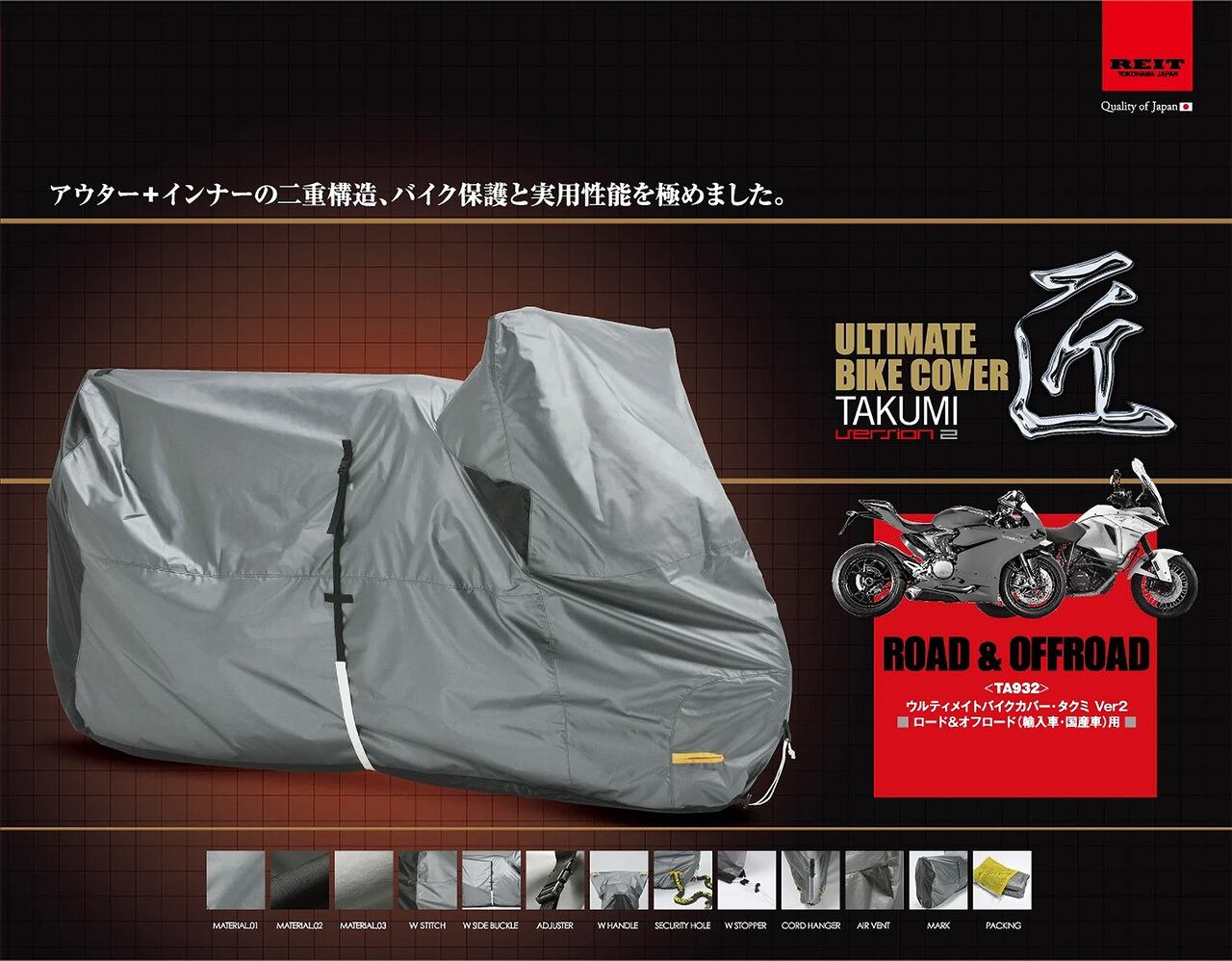 通常のバイクカバー2枚分の工程を掛けて製造されている独自の二重構造を採用。雨、風、埃、紫外線などからバイクを守るため、カバーの製造を外側と内側で別々にして、各部に最高級の素材を使用。独自の立体裁断された生地をダブルステッチ(二重縫製)で仕上げ、浸水の軽減と厳しい環境下での耐久性を向上。日常の使い勝手とフィッティングなど、バイクカバーに求められる条件に高いレベルでお応えすべく、ジャパンクオリティーならではの職人の技術によって造りこまれた逸品です。