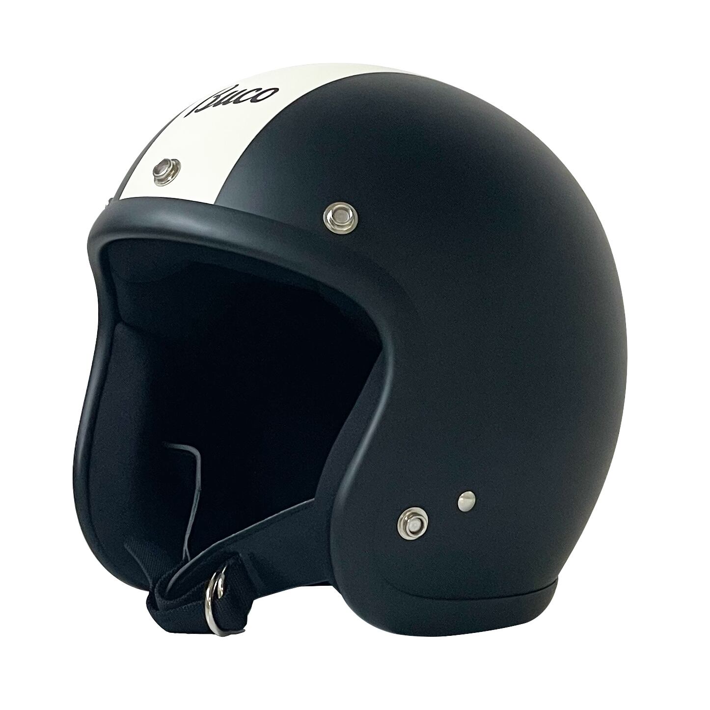 プレーンモデルとベースを同じくして、帽体中央に幅広のストライプとBucoのロゴマークをペイント。アメリカのモーターサイクルカルチャーが全米規模で繁栄を始めた1960年代、ブコはその後押しをすべく一般のライダーに向けてさまざまなペイントを施したバリエーションを投入しました。'70年代はさらにポップなグラフィックが市場を賑わせるが、落ち着いたカラーリングのセンターストライプはその先駆的存在と言えるでしょう。トイズマッコイはヴィンテージを想わせる小ぶりなアウターシェルにもかかわらず、日本の厳しい安全規格を取得したブコヘルメットの開発に成功しました。しかし安全性へのこだわりもさることながら、グラフィックの追求も手を緩めず、ストライプの歪みやロゴのズレなどを厳しくチェックした後に出荷されています。そのクオリティの高さは手に取ると実感することでしょう。